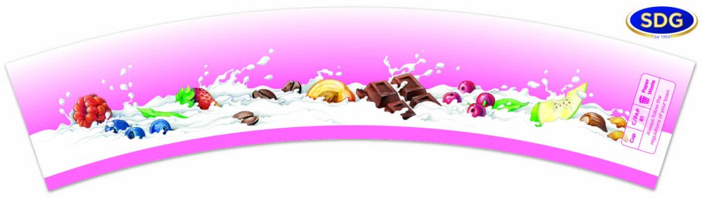 "Latte - Frutta" General graphics. Graphics realised on hot pink background with simple colour gradation. The decorative elements show different pieces of fruits and chocolate floating on a bed of white milk.