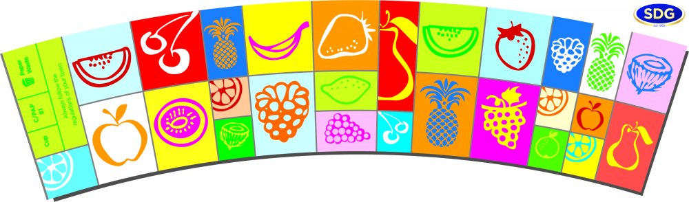 Grafica generica "Tutti-Frutti". Grafica realizzata su sfondo geometrico a scacchiera con diversi colori. Ogni sezione geometrica riporta 1 o più immagini di frutta di vario genere.